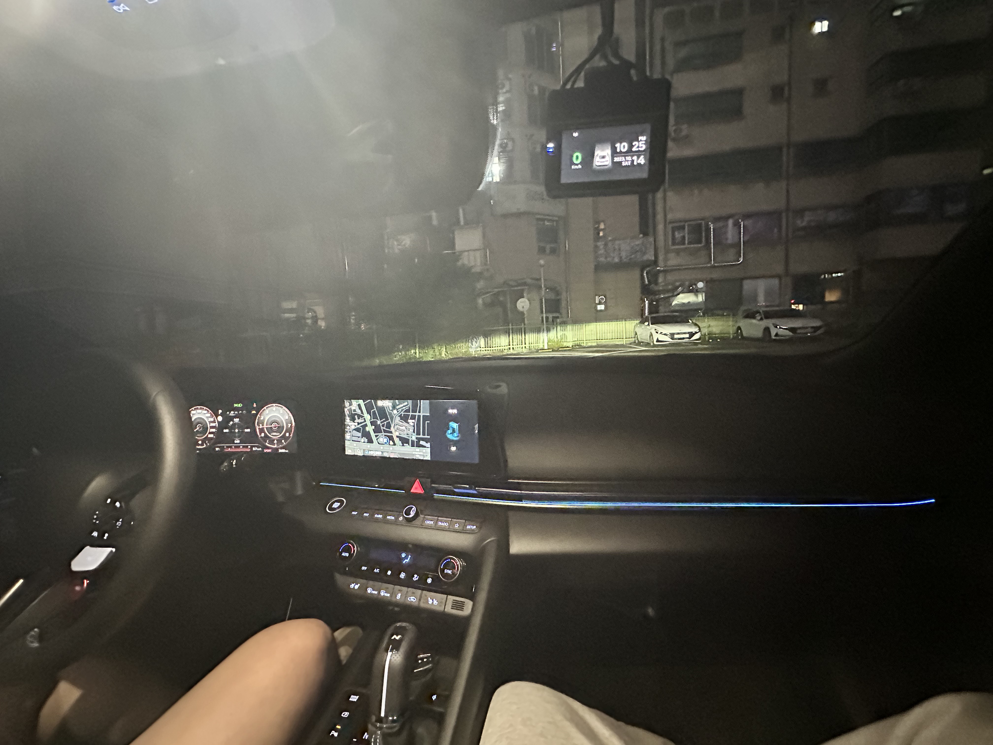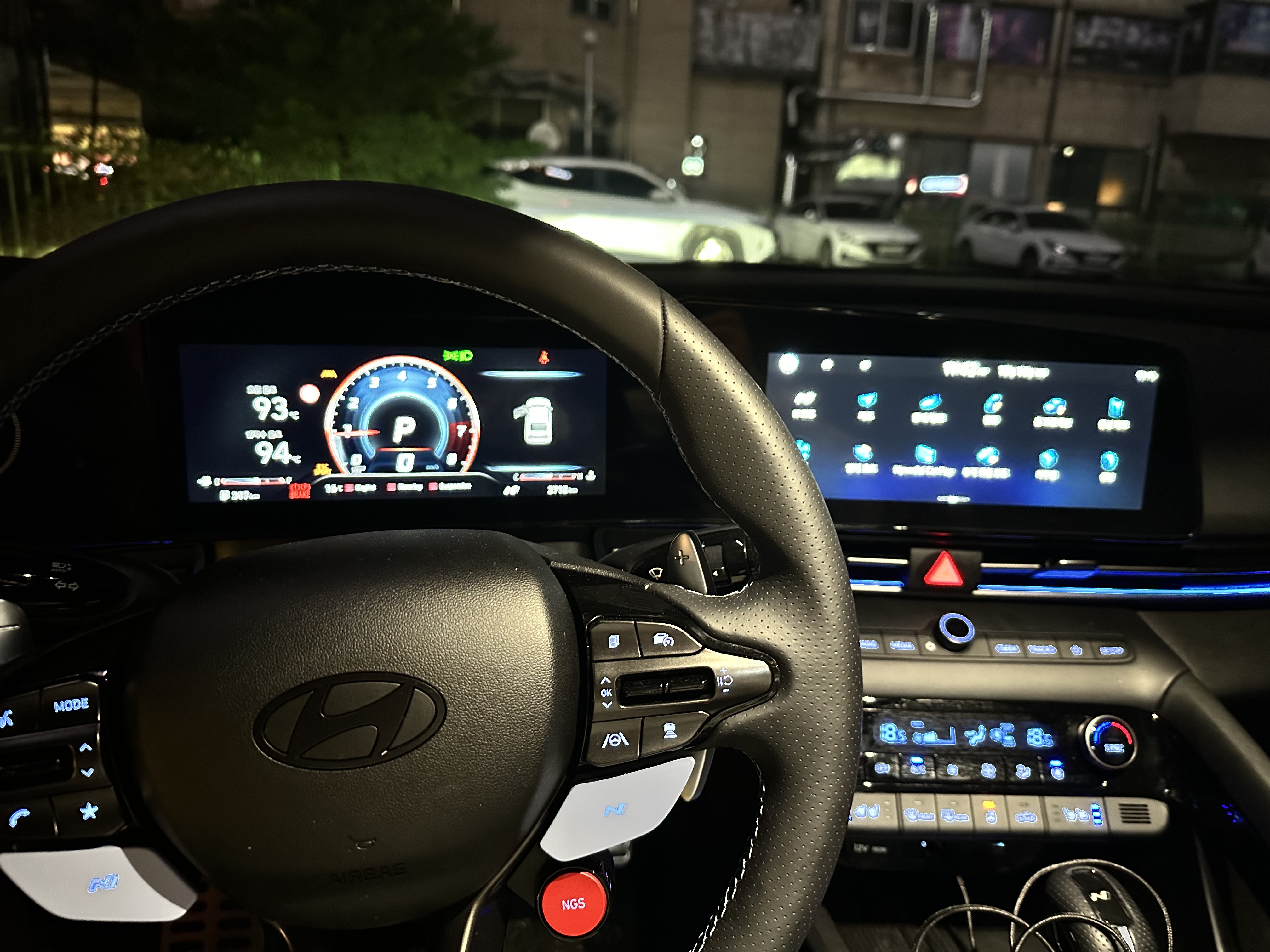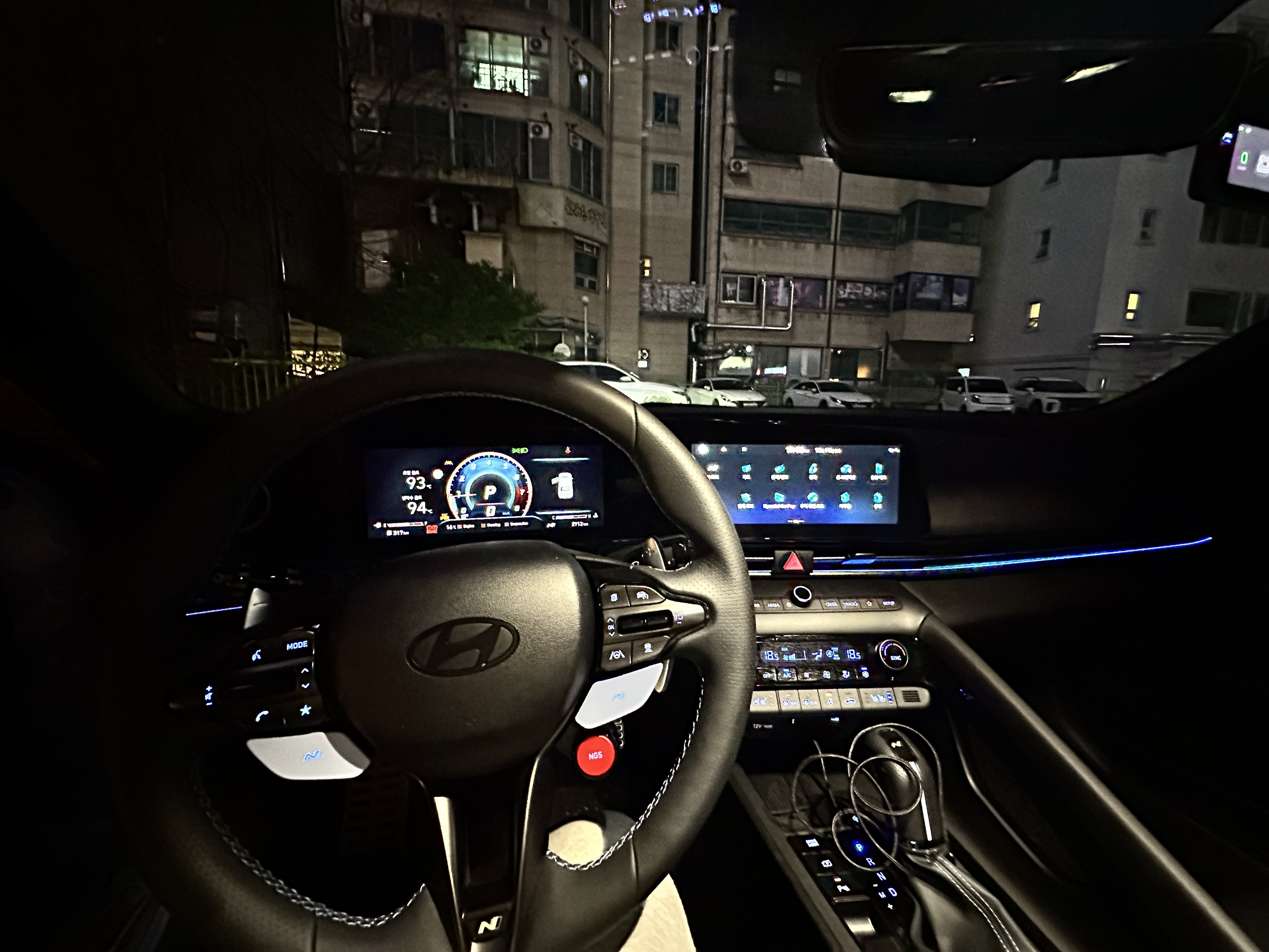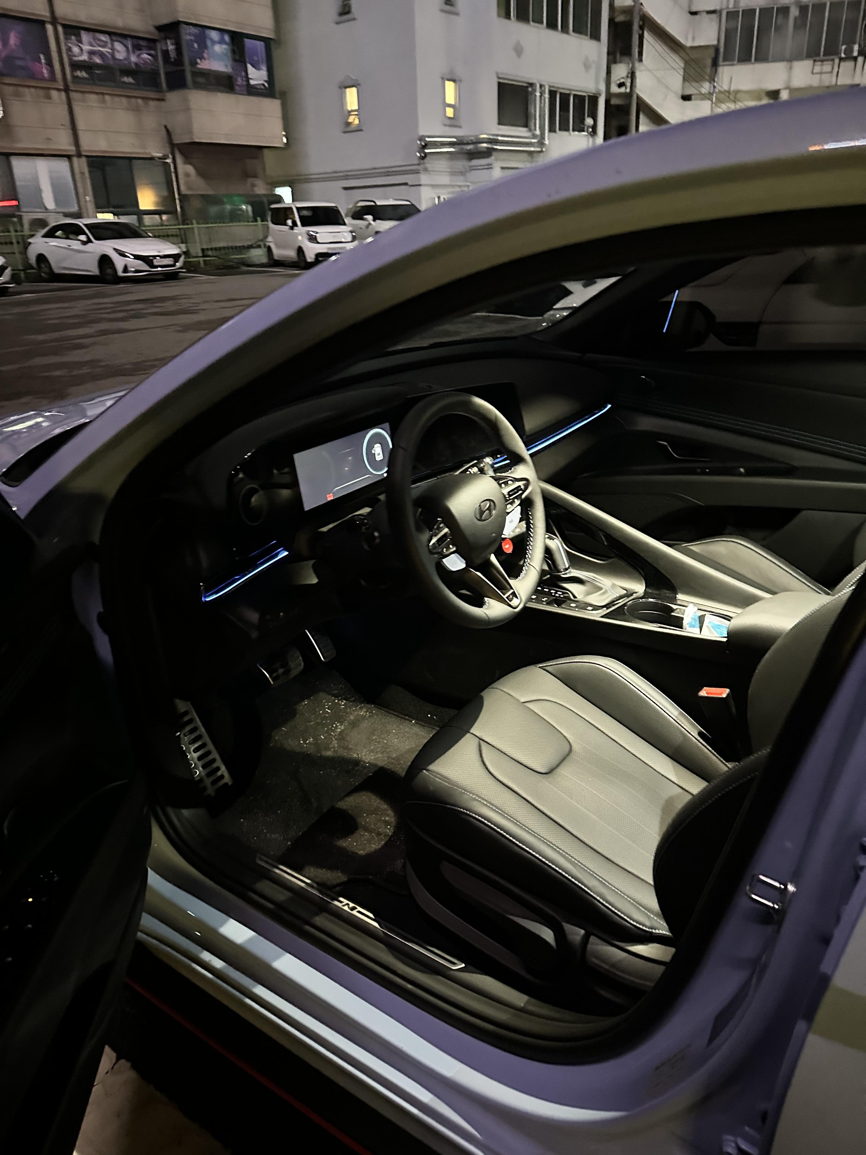 센터페시아와 핸들디자인은 정말 아반떼스럽지 않고 약간 폭스바겐의 '그 차'느낌이 많이 났습니다. 그래도 아반떼가 이정도라니 하고 정말 놀랐습니다. 특히 가장놀랐던 것은 어라운드뷰였습니다. 아니 아반떼에 어라운드뷰라니.. 하고 정말 놀랐습니다. 아반떼N이라서 있는건가? 하고 생각하기도 했는데 알고보니 신형 아반떼에도 어라운드뷰가 나오더군요.. 역시 현대차의 옵션은 정말 세계최고인 것 같습니다. 파란색 엠비언트라이트.. 위험상황에는 빨간색으로 변경되고 핸들엔 뭔가 빨라질 것 같은 버튼들이 달려있습니다.