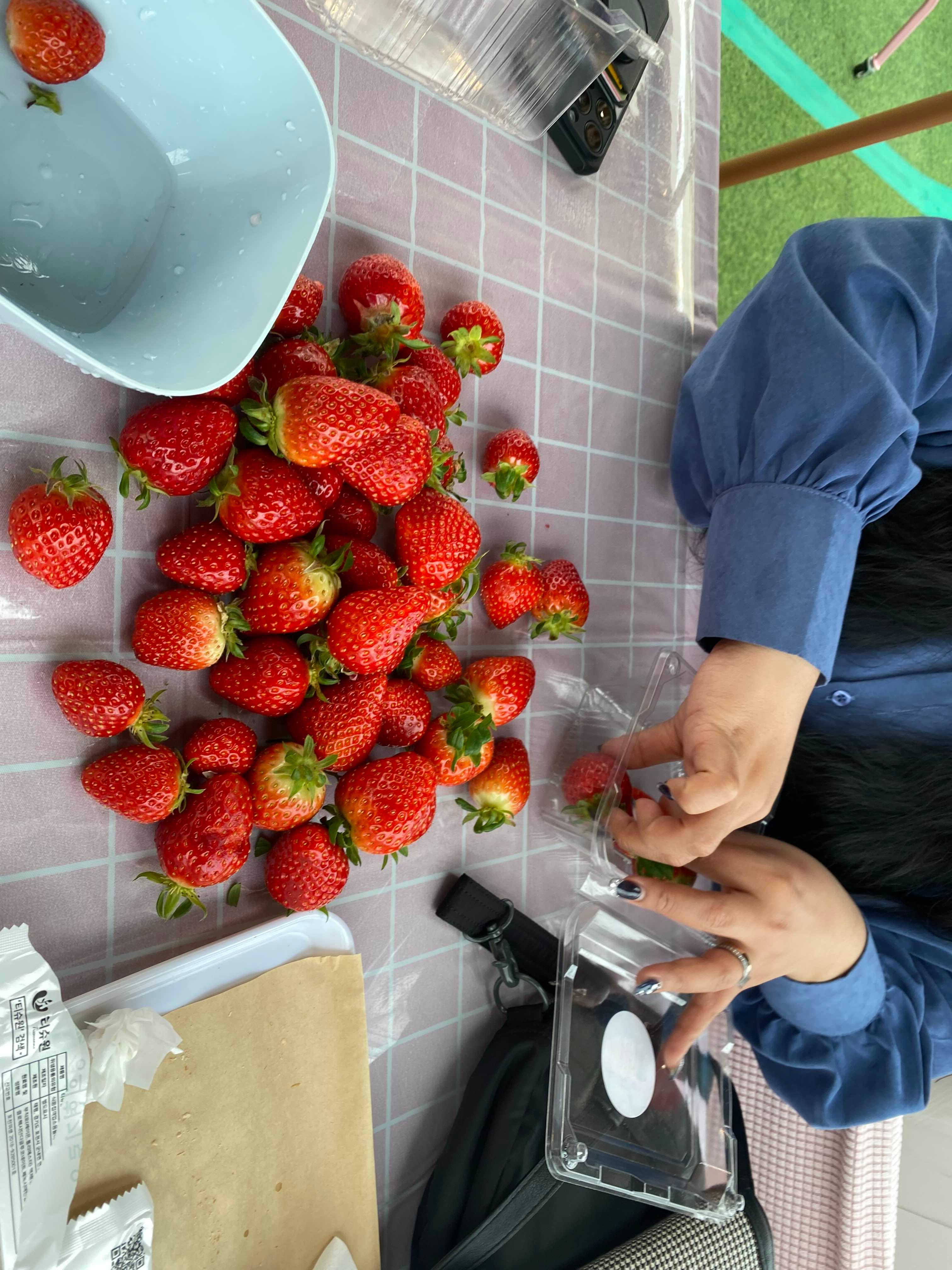 체험 시작 후 1인당 1개의 포장 용기를 받아, 원하는 만큼 딸기를 직접 따서 담을 수 있었어요. 중간중간 먹어도 되는데, 막 따서 그런지 정말 신선하고 달더라고요. 딸기 크기도 크고 당도도 높아서 만족스러웠어요.