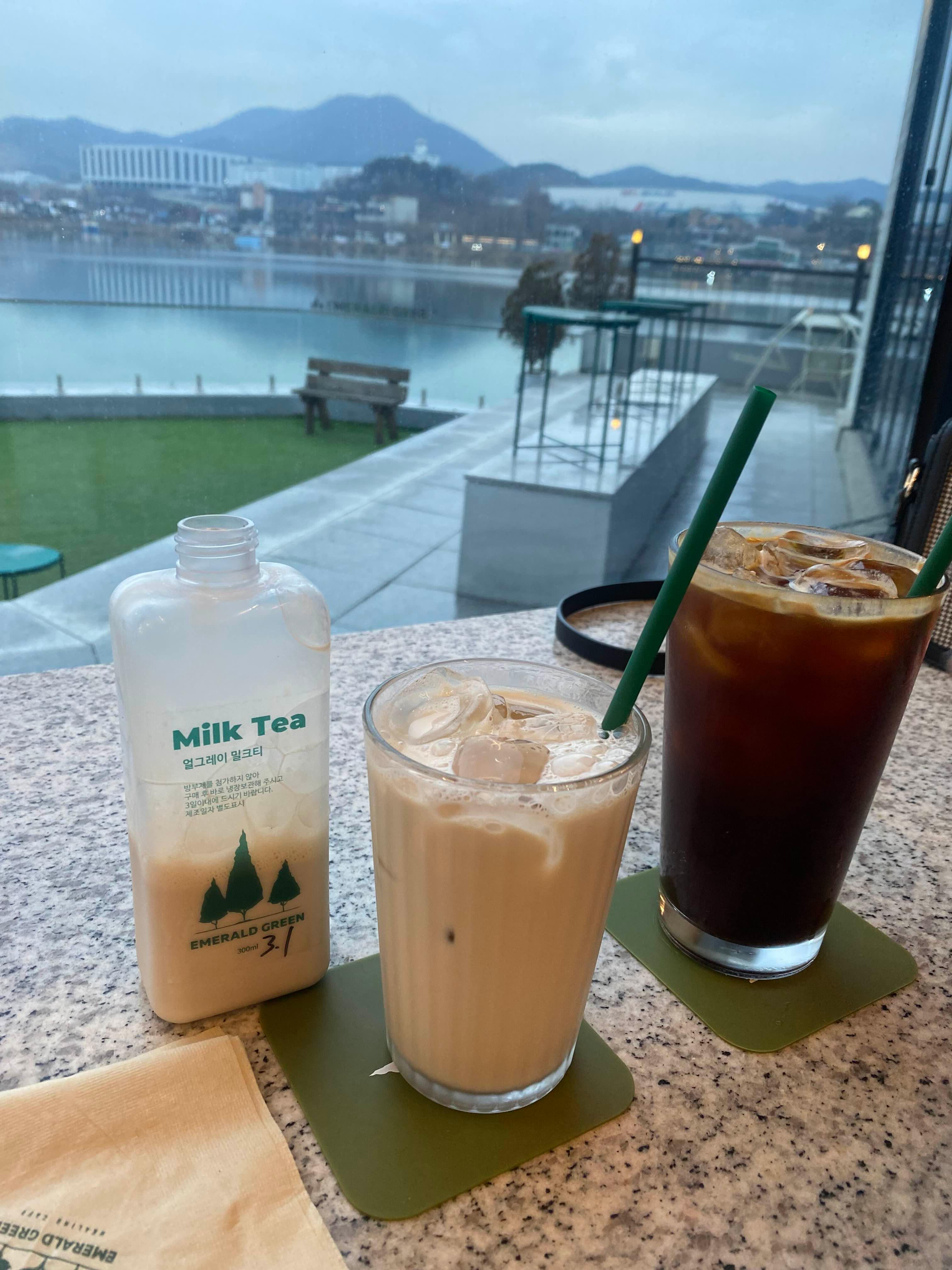 칠곡저수지를 둘러싼 카페들이 많은데, 에메랄드그린 카페는 뷰가 정말 좋아요.