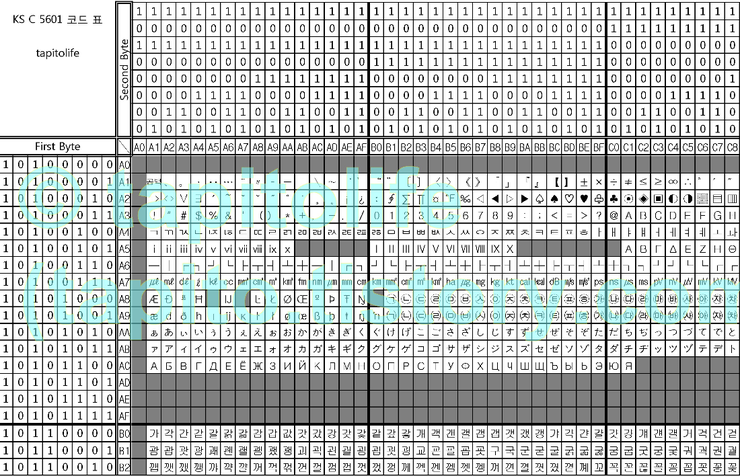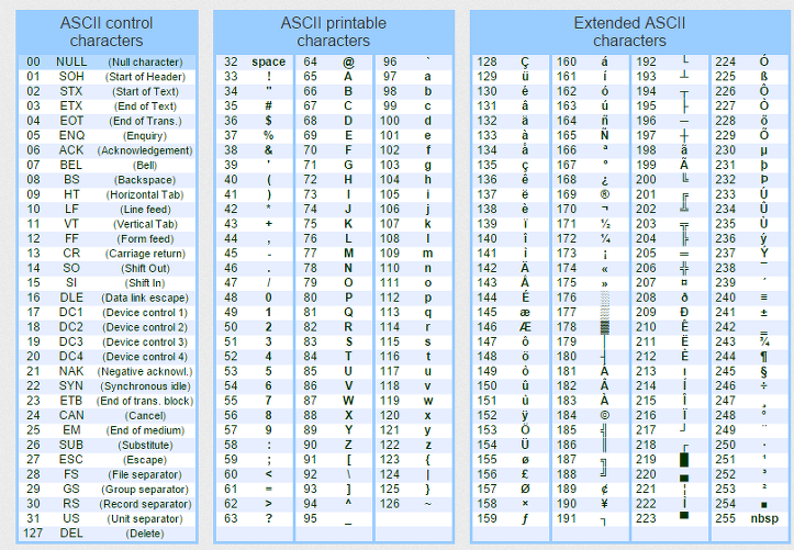아스키 코드란 ANSI 에서 만든 ASCII 라는 표준 코드체계로 일반적으로 사용되고 있습니다. ASCII 는 각 문자를 7비트로 표현합니다. 따라서 2의 7제곱 그러니까 128 개의 문자를 표현할 수 있습니다. (ASCII로 표현할 수 있는 문자들 외에 추가적인 문자를 지원해야 할 필요성이 있어 기존 7비트에 1비트를 추가하여 8비트를 사용한 코드가 정의되었다. 이런 코드를 확장(extended) ASCII라 하는데, 256(= 28)개의 문자를 표현할 수 있다. 기존 7비트 ASCII 코드에는 가장 왼쪽에 0을 추가하여 8비트 형식이 되게 했다.)