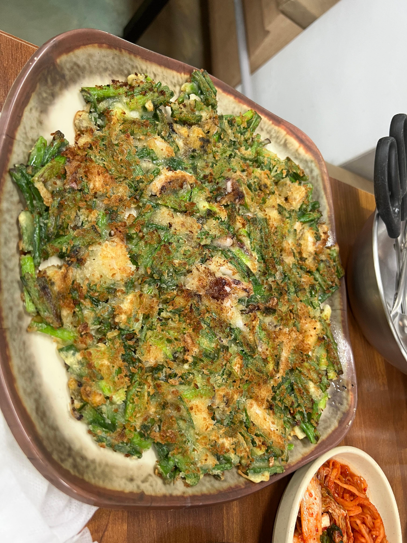 오늘의 하이라이트는 단연 해물파전이었습니다. 바삭함과 촉촉함이 공존하고, 해물도 아낌없이 들어가 있어요.