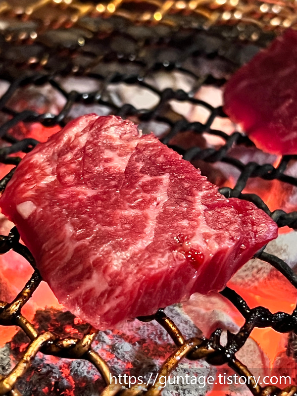 참숯 불판에 구워서불향 가득~ 육즙이 살아 있는 고기맛이 일품이에요.