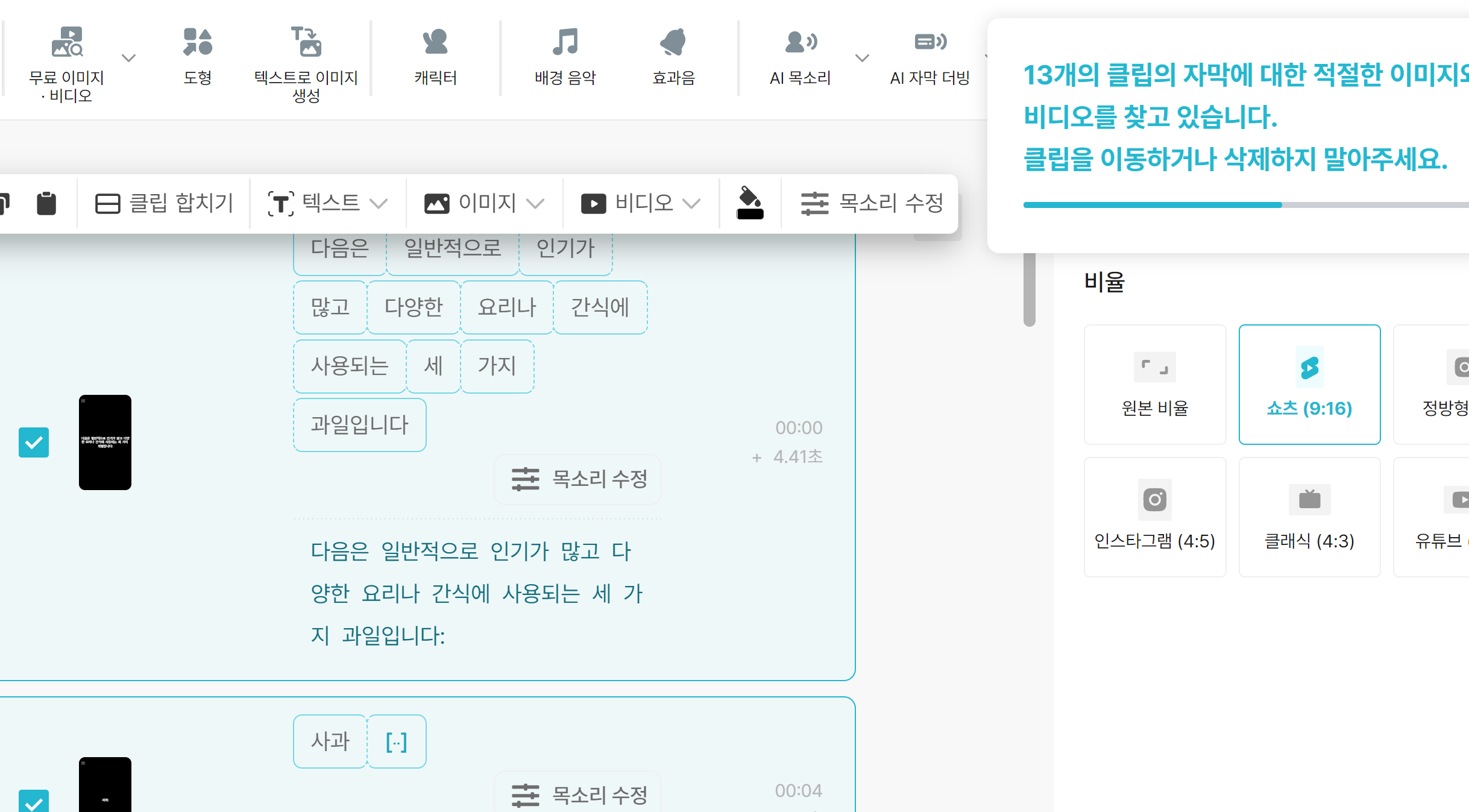 이렇게 vrew내 ai가 대본에 맞게끔 자동으로 이미지,동영상을 삽입해 줍니다!
