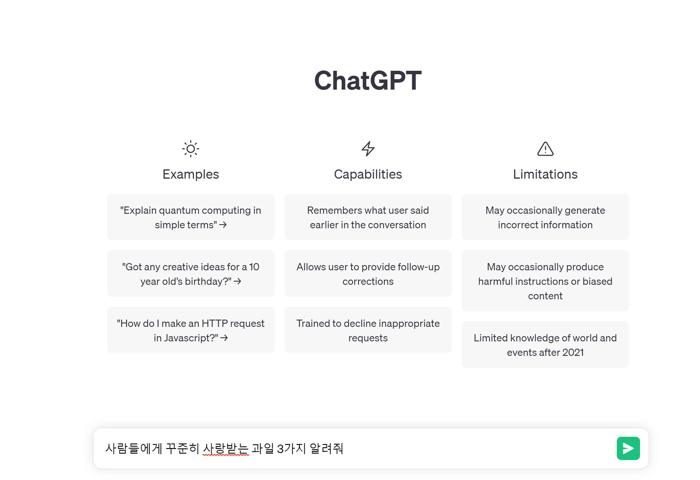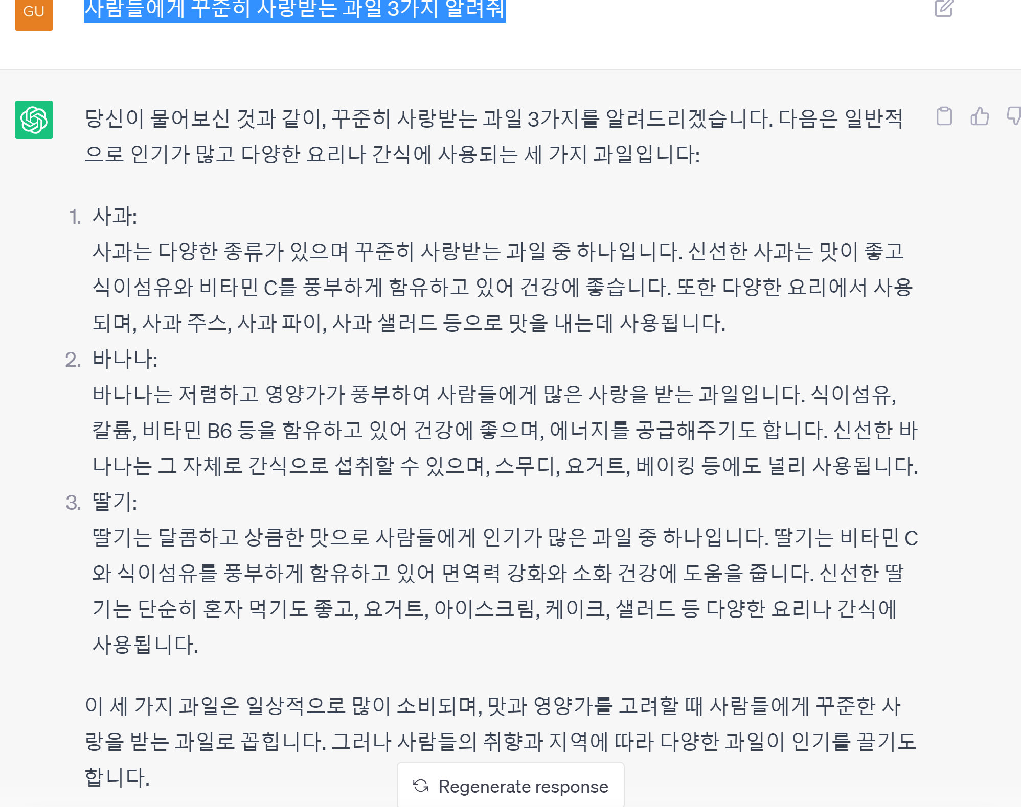 "사람들에게 꾸준히 사랑받는 과일 3가지 알려줘" 라고 한글로 질문 했습니다.