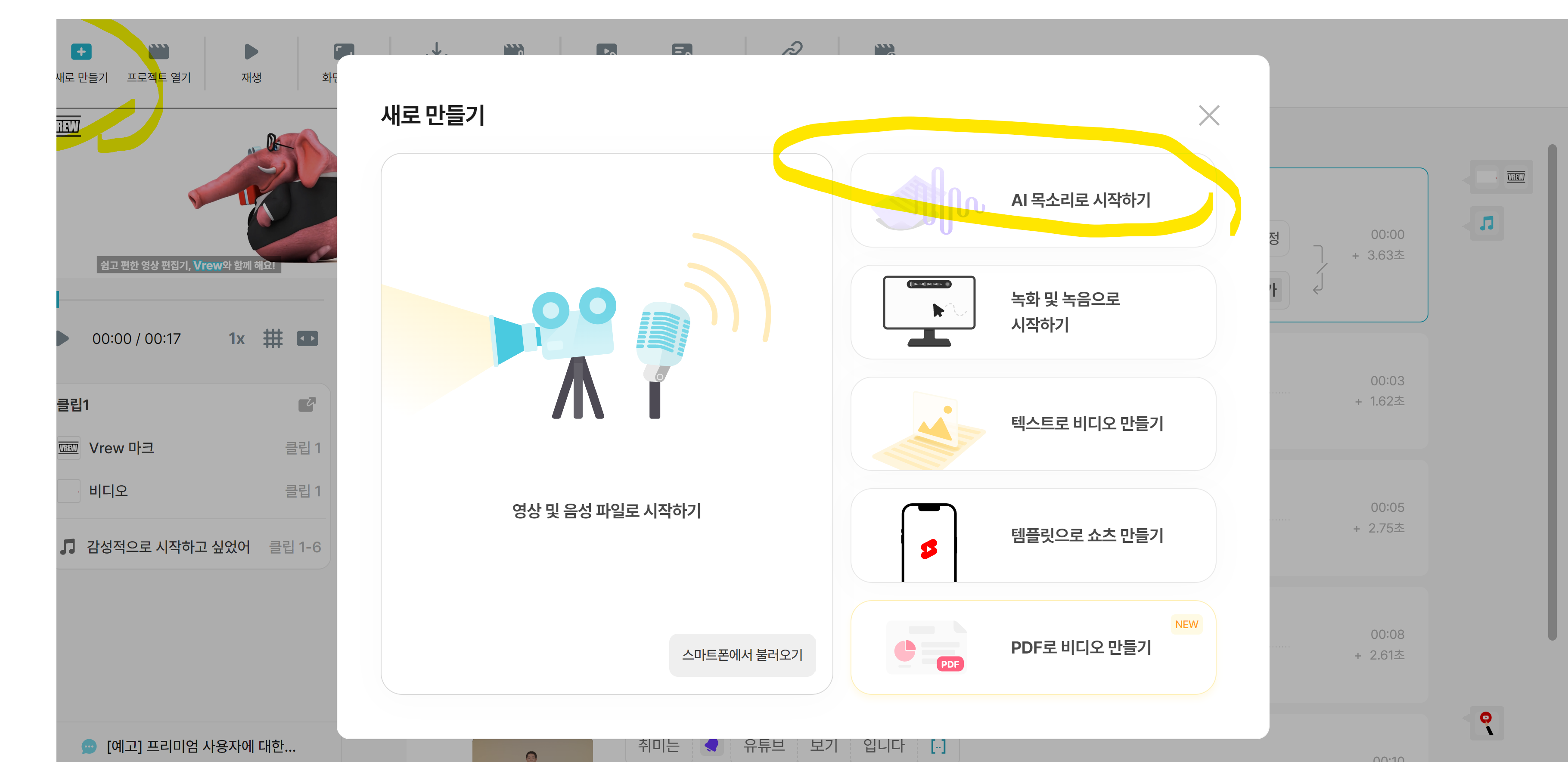 새로만들기를 클릭하신 뒤 AI목소리로 시작하기를 눌러주세요!